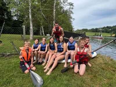 Ein besonderes Highlight war die „Lake-Crossing-Challenge“, die an zwei Nachmittagen für alle Freiwilligen von den Lehrkräften angeboten wurde. Ausgestattet mit einem Rettungstretboot, einem Rettungs-SUP sowie Bojen startete man die Herausforderung. Insgesamt 17 Schülerinnen und Schüler nahmen daran teil. Wer es schaffte, den See zu durchqueren und auch wieder zurückzuschwimmen, erhielt beim Abschlussfest in der Schule eine Urkunde.